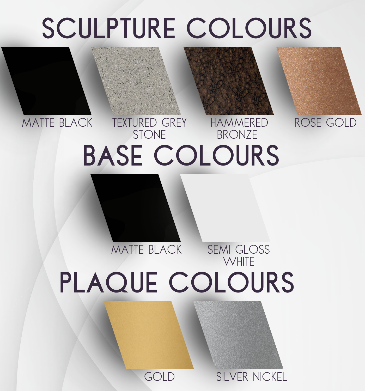 Each sculpture is finished in your choice of high-quality textures or metallic tones: