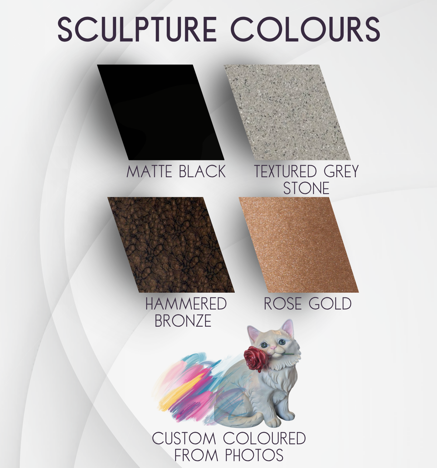 Matte Black, Textured Stone Grey, Hammered Bronze, Rose Gold.